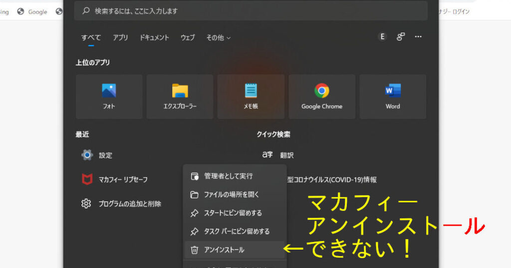 - アンインストールをクリックする。マカフィーを選択後、「アンインストール」ボタンをクリックします。