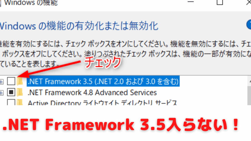 - .NET Framework 3.5 (含む.NET 2.0および3.0)にチェックを入れます。