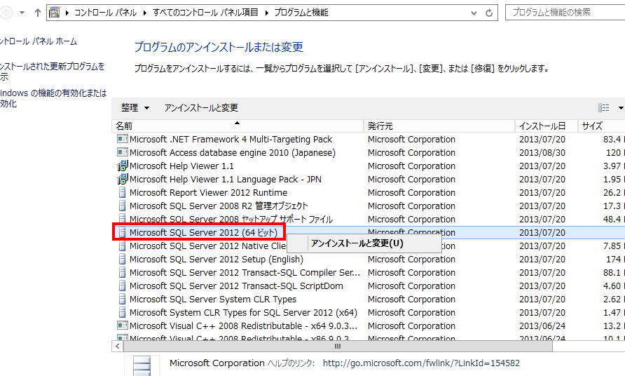 インストールされたプログラムのリストから「Microsoft SQL Server」を探す。
