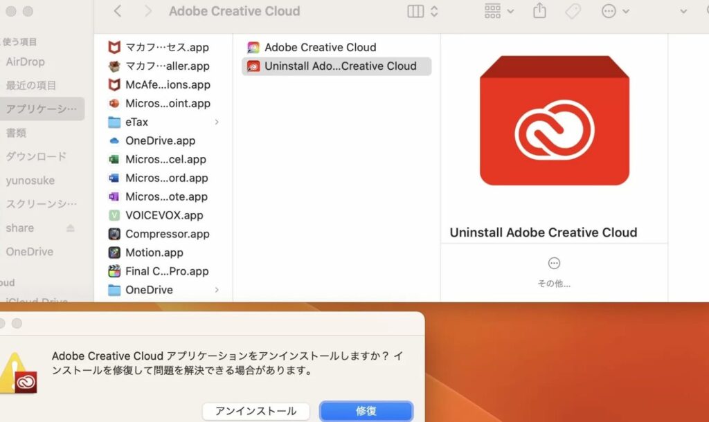 Adobe Creative Cloudをクリックし、「アンインストール」を選びます。