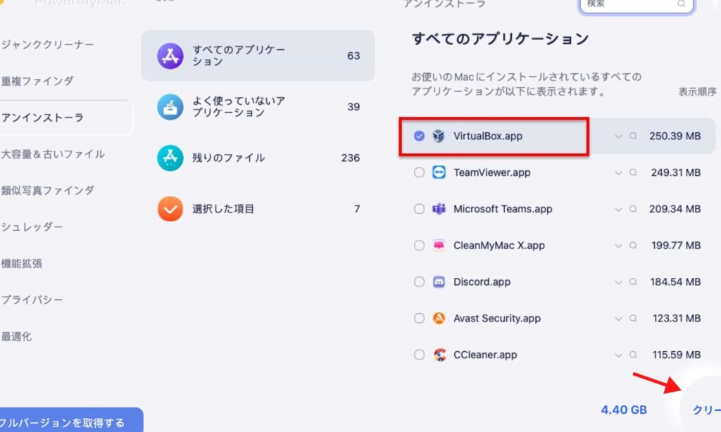 - アンインストールを選択。 VirtualBoxの項目をクリックし、「アンインストール」を選びます。