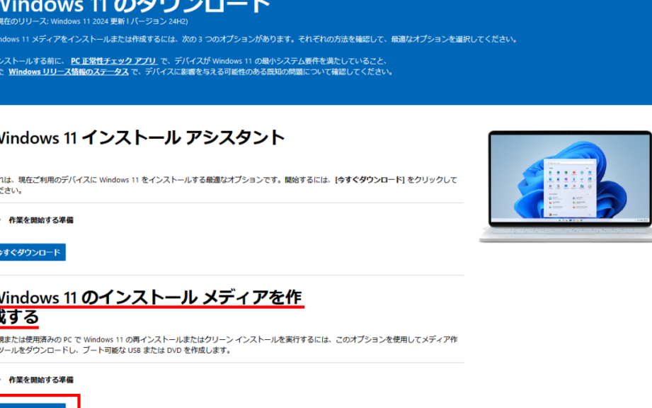 - メディアの作成: ツールを起動し、インストールメディアをUSBドライブまたはDVDに作成します。