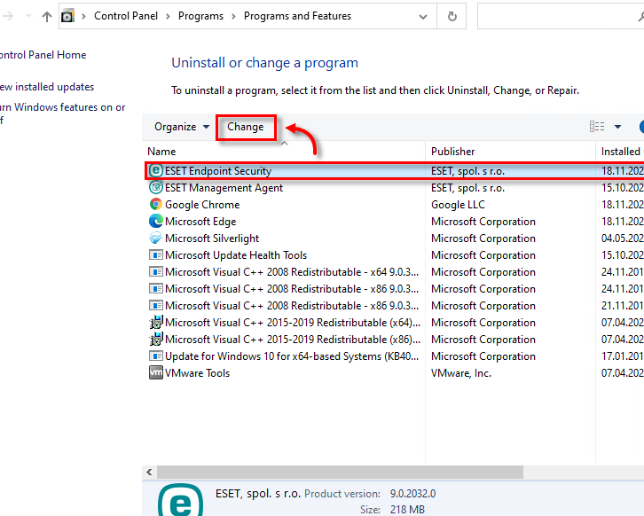 - インストールされているアプリのリストから、Eset Endpoint Securityを見つけます。