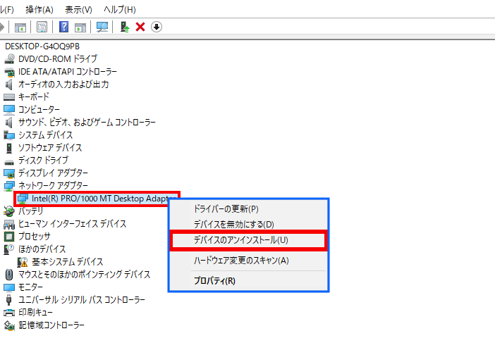 - ドライバーのアンインストール。デバイスマネージャーで、目的のネットワークアダプタを右クリックし、「アンインストール」を選びます。