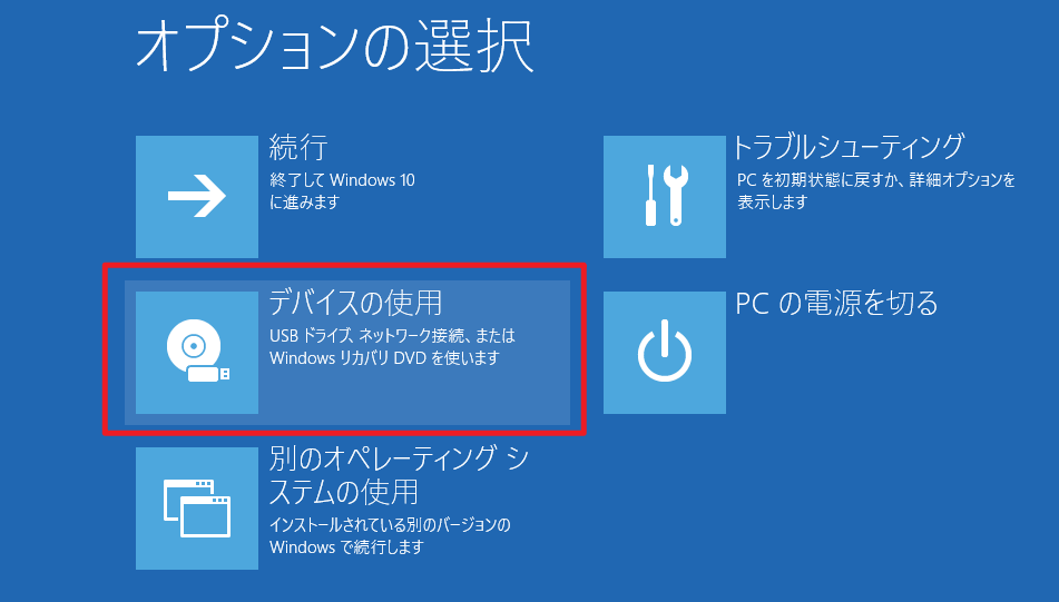 - PCを再起動する。 USBメモリが接続されている状態で再起動します。
