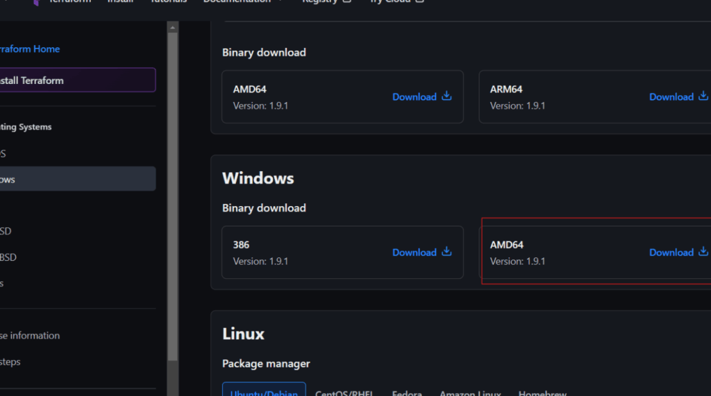- 公式サイトにアクセスし、Linux向けの最新のTerraformバイナリを選択します。