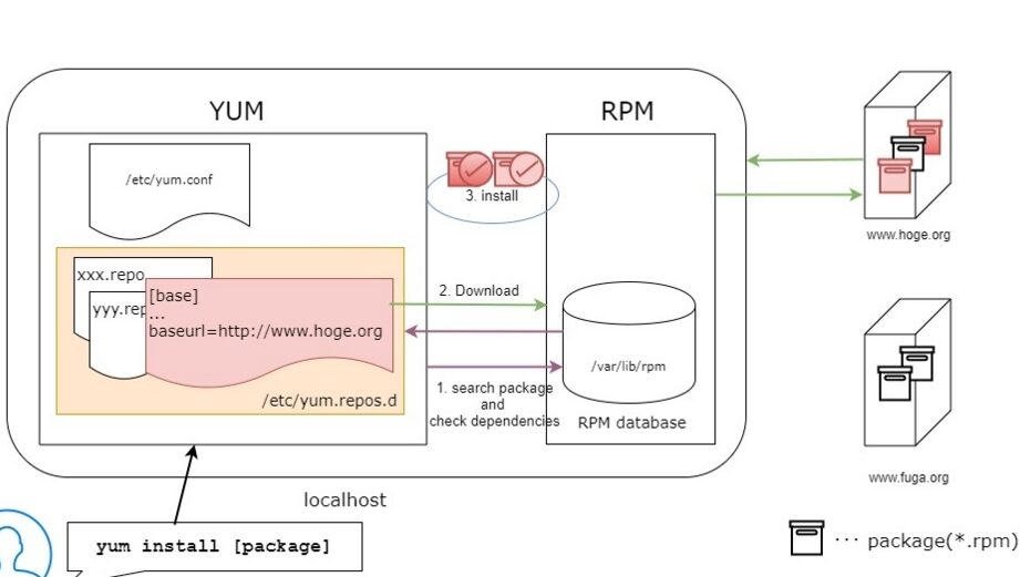 yum install [パッケージ名]を使用します。このコマンドは指定したパッケージをインストールします。yum updateを使うことで、システム内の全てのパッケージがアップデートされます。yum remove [パッケージ名]を入力することで、指定したパッケージがシステムから削除されます。yum info [パッケージ名]を使うことで、そのパッケージに関する情報が表示されます。- 通常、