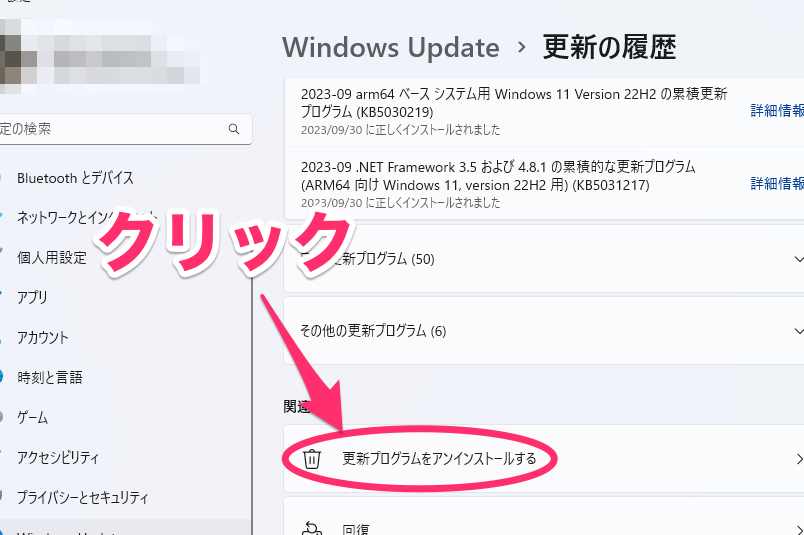 「更新履歴を表示する」リンクをクリックし、インストールしたアップデートのリストを確認します。