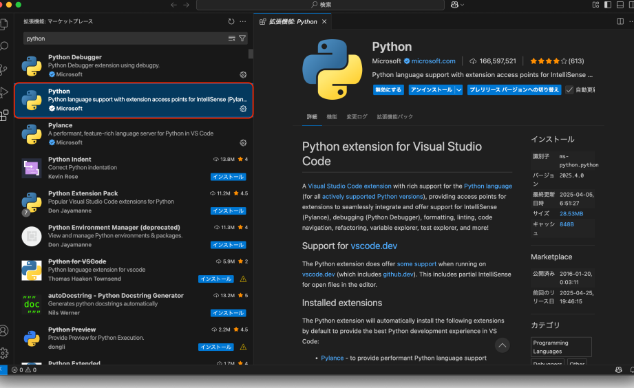 - 表示されるリストから「Python」拡張機能を見つけます。