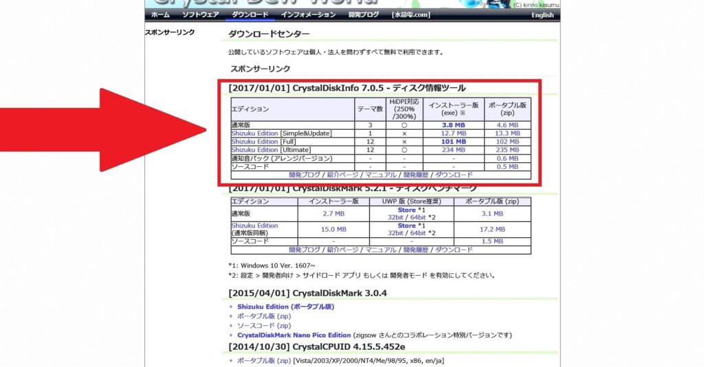 - 公式サイトにアクセスします。 CrystalDiskInfoの公式サイトで最新バージョンを探しましょう。