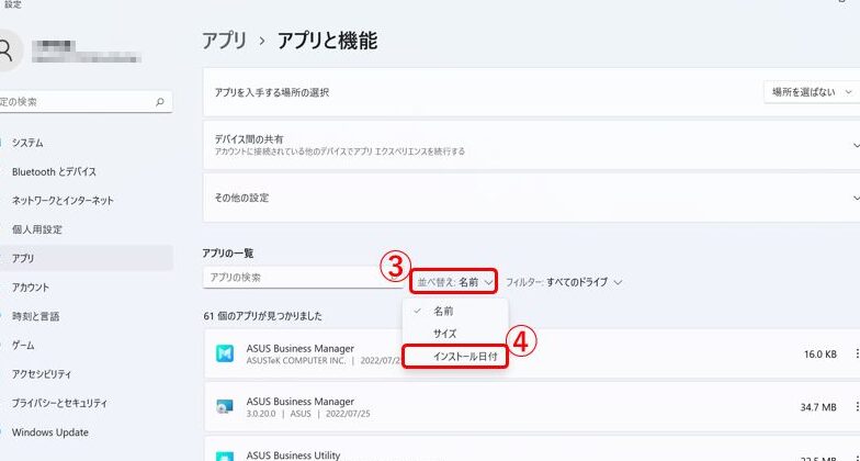 - アプリと機能を表示する。アプリの一覧が表示されます。