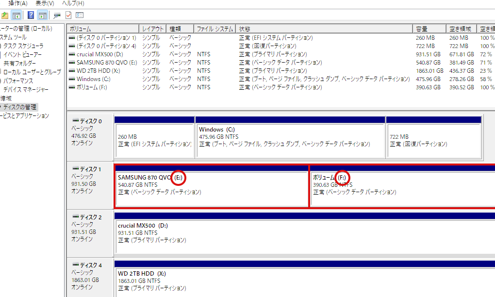 - パーティションの状況を確認するために、ディスク管理ツールを利用する。
