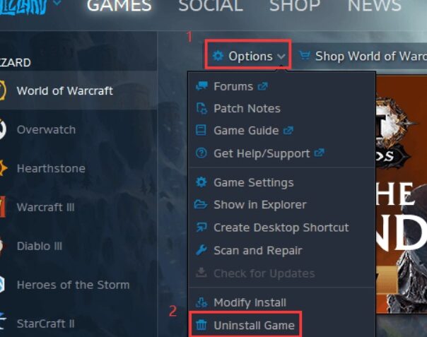 - 「バトルネット」をクリックし、「アンインストール」を選択する。