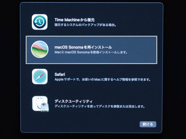 リカバリーモードを使って、macOSを再インストールすることができます。次の手順で実施しましょう。