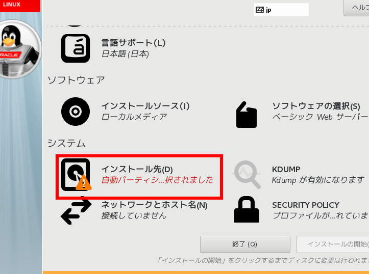 - インストール手順に従う。 パーティション設定やソフトウェアの選択を行う。