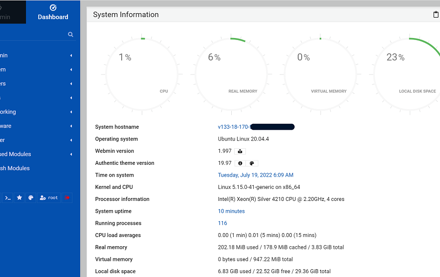 ログイン後、Webminのダッシュボードが表示されます。これにより、サーバーの各種設定へアクセスできるようになります。