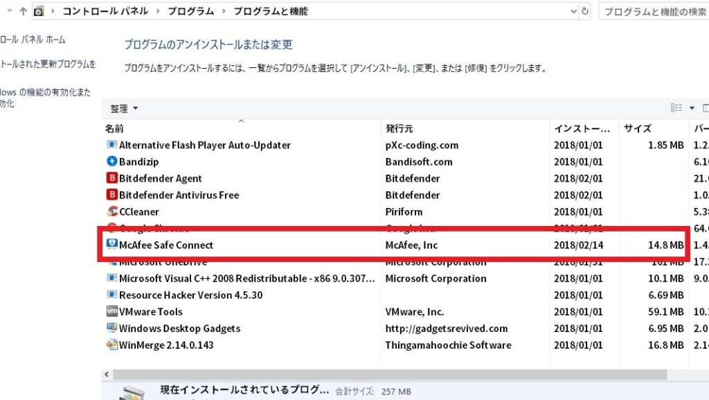 - リストからMcAfee Safe Connectを見つけ、アンインストールします。