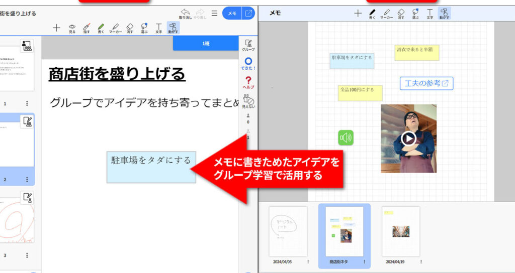 - グループプロジェクト: 生徒同士が共同で課題に取り組む際、メタモジ教室を使ってアイデアをリアルタイムで共有します。これにより、インタラクティブな学習環境が整います。