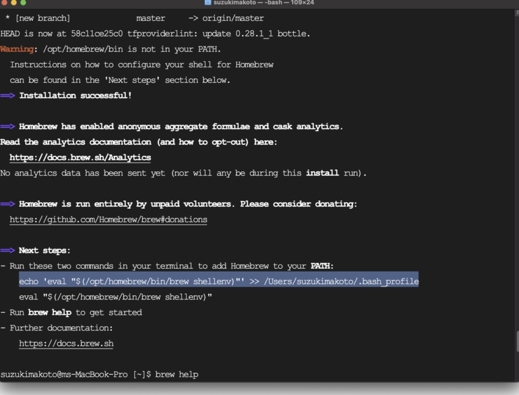 - /bin/bash -c “$(curl -fsSL https://raw.githubusercontent.com/Homebrew/install/HEAD/install.sh)”と入力してEnterキーを押します。