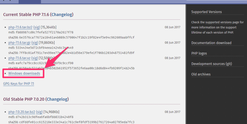 PHPの最新安定版ZIPファイルをダウンロードするため、公式サイトに移動します。