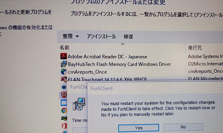 - アンインストールの確認画面で「はい」を選択します。これにより、Fortinetがシステムから削除されます。