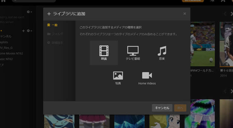 - ライブラリの作成を行います。メディアの保存場所を指定し、映画や音楽のカテゴリを選択します。