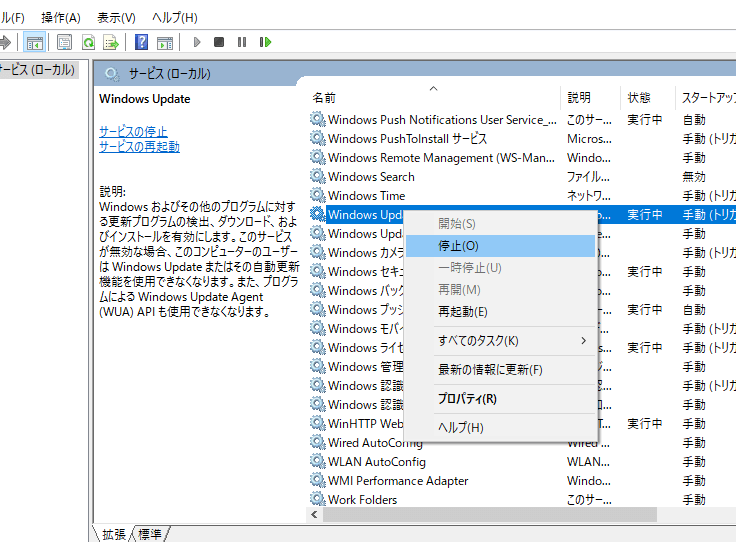 サービスの管理からWindows Updateサービスを停止し、その後再起動します。