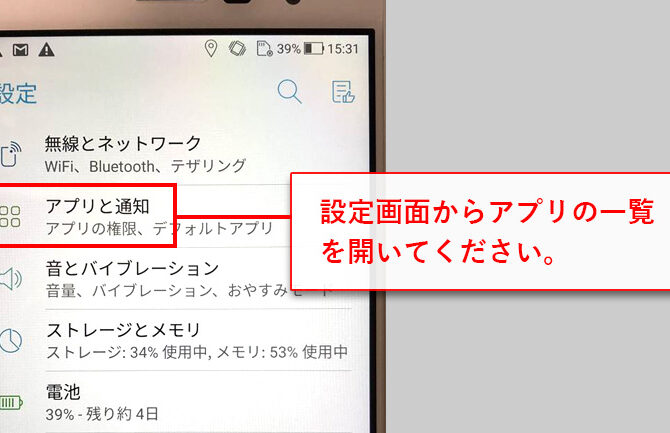 スマホの設定からアプリの一覧を開きます。
